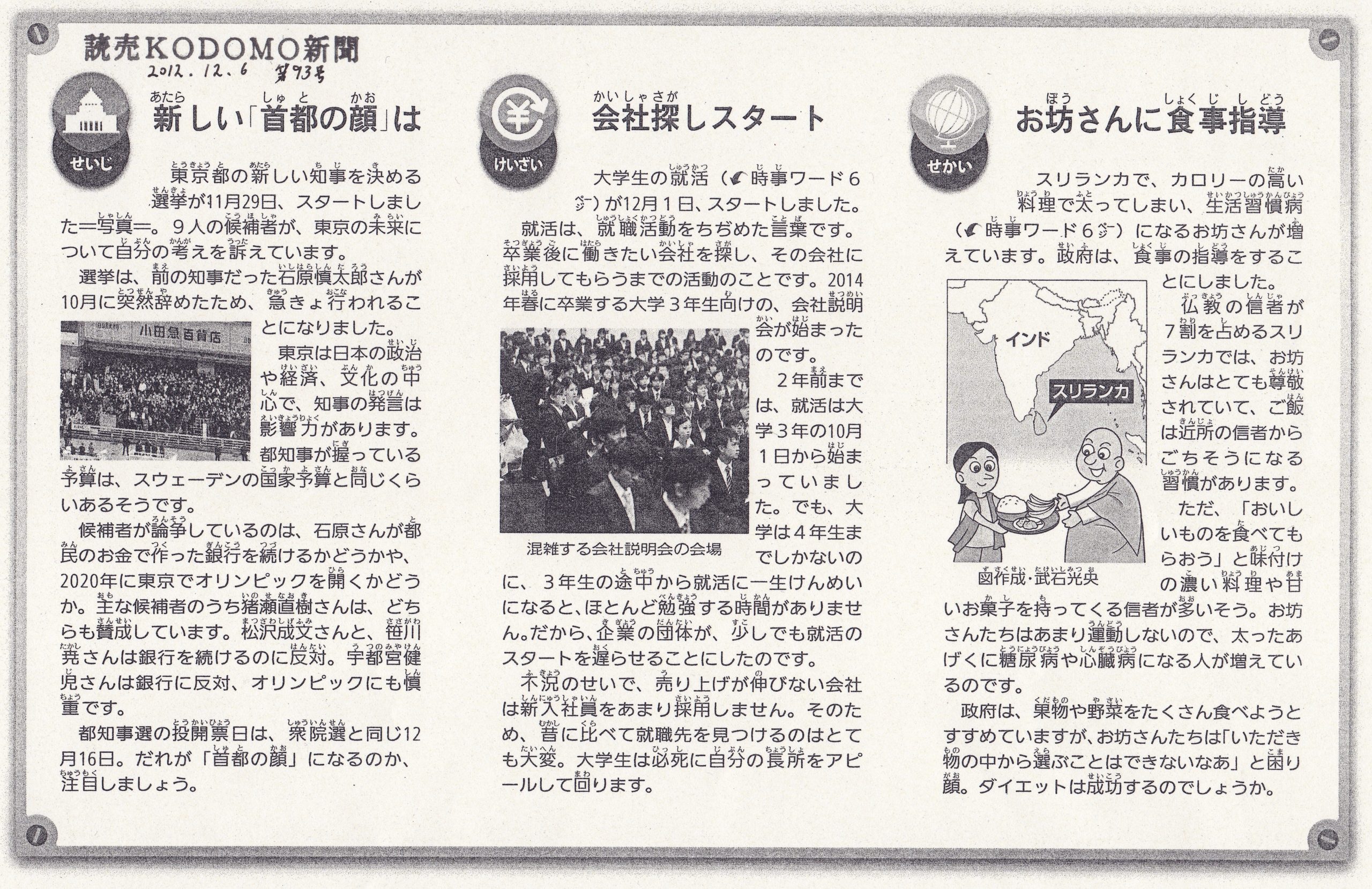子ども新聞の特長は、小学生の読解力でも読めるように、短くて分かりやすく編集されているため、子どもでも読みやすくなっています。また、全ての漢字に振り仮名が振ってあるので漢字が読めないという心配がありません。