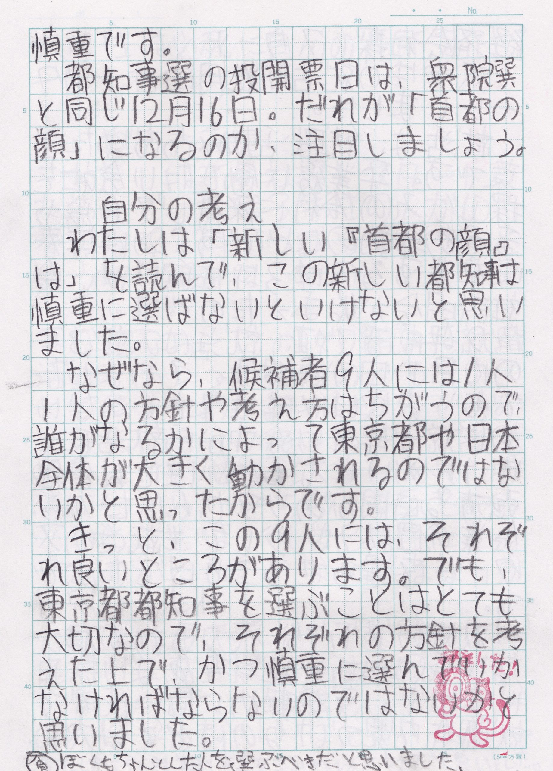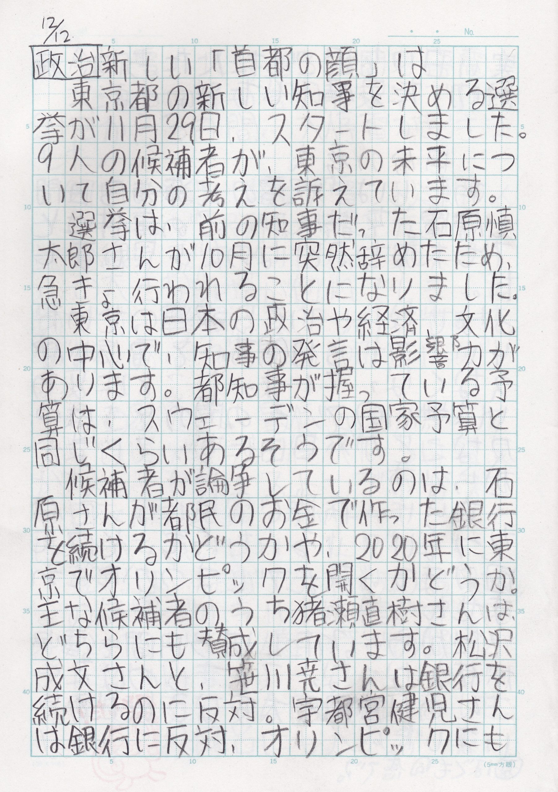 新聞の記事を視写し、記事に対して、自分の考えを書くことによって、自分の考えをもつことを習慣づけることが主なねらいです。